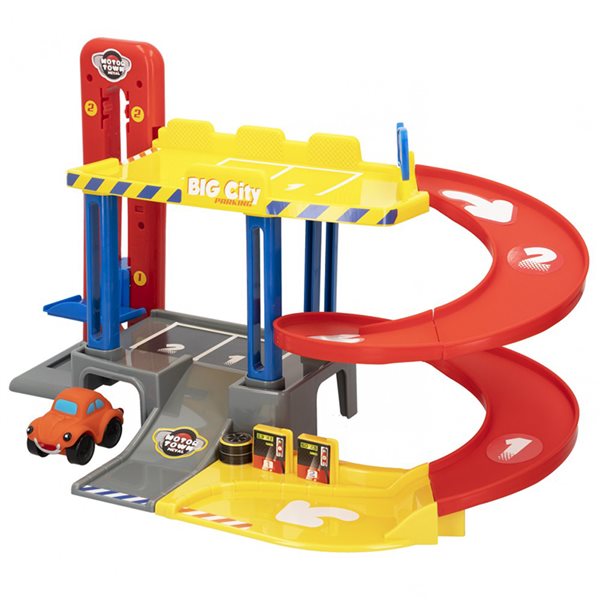 ¡Cuánto ir y venir de cochecitos! Pon orden en la ciudad con el garaje de Motor Town y controla el estacionamiento de los vehículos para que circulen más ordenados. El parking tiene 2 plantas a las que se puede acceder por un gran ascensor. Para bajar, ¡utiliza la rampa en espiral y observa la velocidad que alcanzan los cochecitos! Si se quedan sin gasolina... ¡a la estación de servicio! Y si llueve, podrán estacionar a cubierto. ¡Es muy completo! Además, incluye 1 simpático cochecito para mayor diversión. Juguete simbólico que fomenta la imaginación al ser un juego libre y la socialización al poder jugar con más niños. Desarrolla la coordinación ojo-mano al conducir el coche por los diferentes accesos y la orientación espacial y la comprensión causa-efecto al lanzar los coches por las rampas o subirlos por el ascensor.