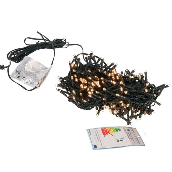 Guirnalda navideña de 5 m de longitud y equipada con un total de 100 micro bombillas de iluminación LED cálida de bajo consumo. Puede utilizarse en decoraciones tanto de interior como de exterior. Incorpora distintos juegos de luz distinto. Cada una de esas bombillas tiene diseño cuadrado y permanecen unidas mediante un extenso cable negro; ideal para que se mimetice con las ramas del árbol y de la sensación visual que la luz va incorporada en la propia frondosidad de la planta. La separación entre todas ellas es de apenas 10 cm por lo que la atmósfera visual será mucho más cálida.