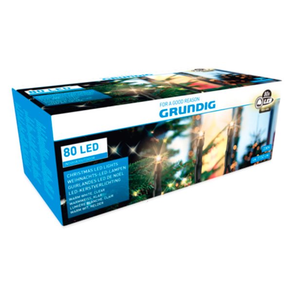 Estupendo set de 80 luces para colocar en el árbol durante estas fiestas. Estas navideñas luces te ayudaran a decorar tu árbol este año y que quede espectacular. Este artículo de la marca Grundig incluye 80 luces LED que emiten una cálida luz amarilla y con un consumo muy reducido. Otra gran ventaja de las luces LED es que generan mucho menos calor que las luces tradicionales por lo que son más seguras para familias con niños. Sin duda un elemento que no puede faltar en tu árbol estas navidades.