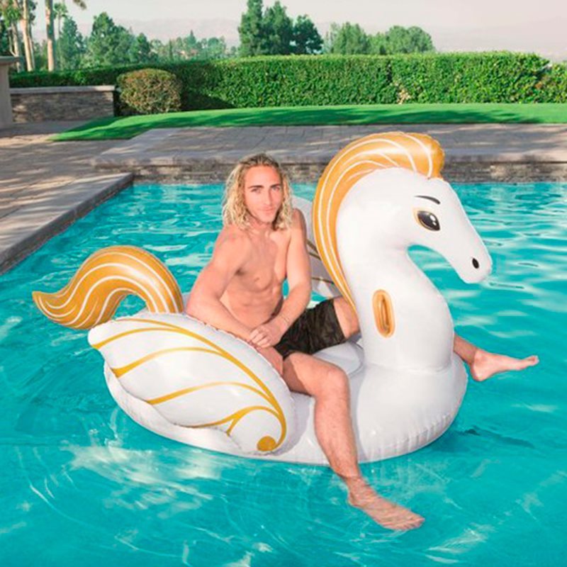 Tendrás la oportunidad de subirte al majestuoso caballo alado de la mitología griega, Pegaso, gracias a este hinchable de grandes dimensiones. Se trata de una maxi colchoneta de más de 2 metros de longitud, con la forma de este mítico personaje, de color blanco y con ornamentaciones doradas. Te la podrás llevar tanto a la playa como a la piscina y te resultará muy cómoda si quieres acostarte sobre ella o, si por el contrario, prefieres surcar las aguas galopando a caballo. Este hinchable de la marca Bestway está fabricado en vinilo muy resistente y sin ftalatos, uno de los compuestos químicos más contaminantes. Es de tacto suave e incorpora dos asas en el cuello para facilitar la sujeción.