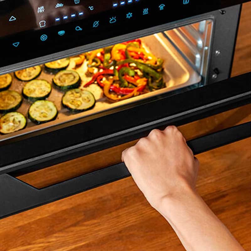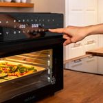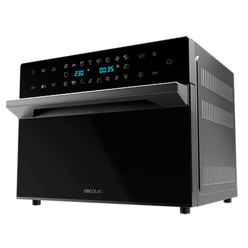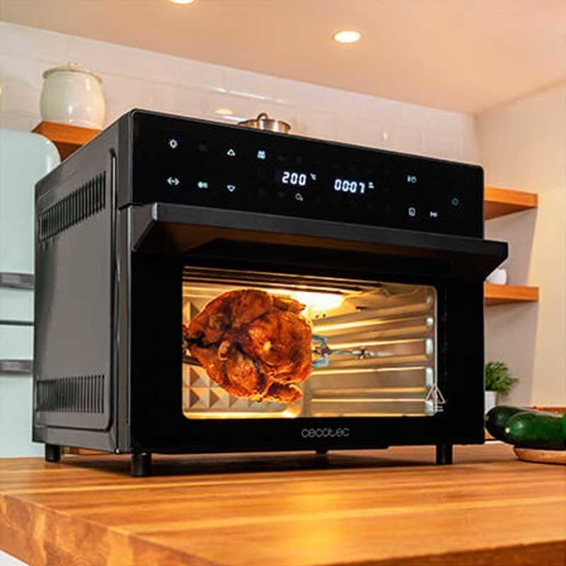 El horno de sobremesa modelo Bake&Fry 3000 Touch de la marca Cecotec cuenta con una capacidad de 30L y una potencia de 1800W para un alto rendimiento. Podrás freír con aire y conseguir características similares a las de los fritos sin apenas grasas. Cuenta con una gran pantalla táctil desde la que podrás seleccionar entre sus 18 funciones preestablecidas: freír, patatas fritas, alitas de pollo, costillas, pizza, verduras, galletas, aperitivos, bagel, tostar, asar, hornear, grill, deshidratar, calentar, fermentar, descongelar y recalentar. Su puerta es de 4 capas y de doble cristal de alta resistencia. Además, incluye rustidor, bandeja para freír, bandeja para hornear, parrilla, bandeja recoge-grasas, piedra para pizzas y asa del rustidor. Cuenta con temporizador de hasta 12 hroas y cocina por convección de manera homogénea para que el aire envuelva los alimentos consiguiendo resultados más tiernos y sabrosos. Viene con luz interior, su temperatura es regulable hasta los 230ºC y podrás regular la altura de la bandeja en 4 niveles diferentes.