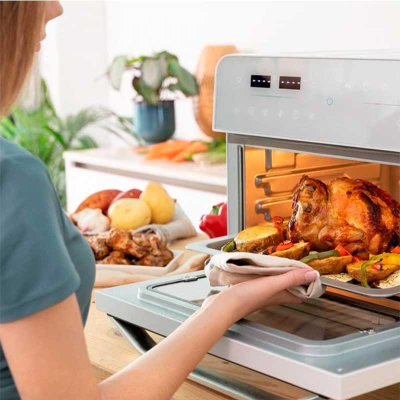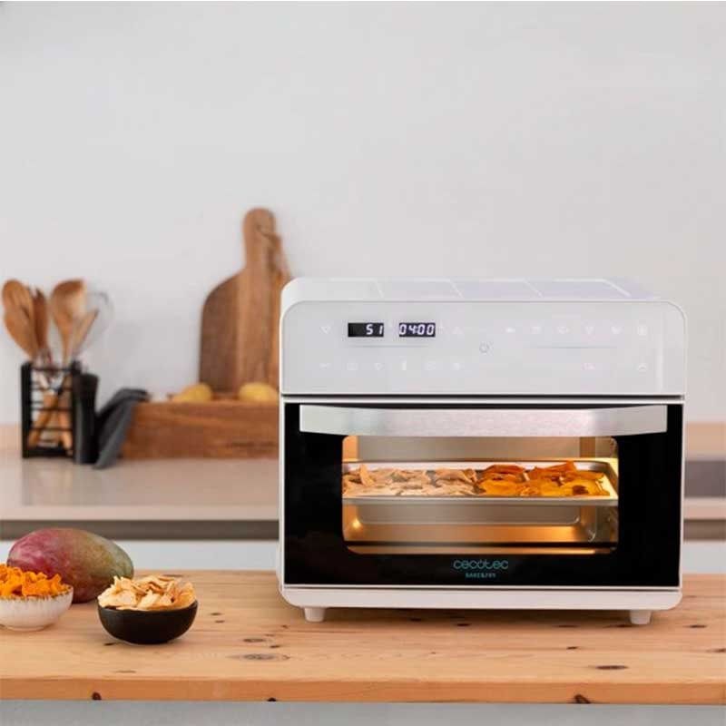 El horno de sobremesa modelo Bake&Fry 2500 Touch White de la marca Cecotec cuenta con una capacidad de 25L y una potencia de 1800W. Podrás configurarlo fácilmente mediante su gran pantalla táctil. Viene con 12 funciones preestablecidas: patatas fritas, alitas de pollo, filete, pizza, verduras, tostar, asar, hornear, grill, deshidratar, calentar y fermentar. Viene con temporizador de hasta 12 horas e incluye bandeja para hornear, parrilla, cesto de freidora y bandeja recoge-grasas. Cocina por convección de forma homogénea y su temperatura es regulable hasta 230ºC. La altura de la bandeja es regulable en 4 niveles diferentes y viene equipado con luz interior. Su puerta es de 5 capas y cuenta con doble acristalamiento.