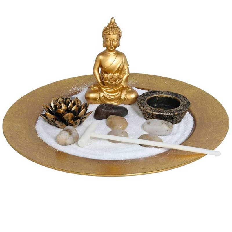 La decoración que escogemos para nuestro hogar definirá nuestra propia personalidad y el estilo que queremos aportar en cada una de las estancias. Es por eso que debes escoger piezas de calidad únicas. El jardín Zen modelo Buda Kalu es una pieza fabricada en resina y quedará ideal en estanterías, mesas o recibidores creando un ambiente muy relajado. Viene con acabado en color dorado que le aporta elegancia y sofisticación. Incluye 1 plato, 1 figura de Buda sentado, 1 porta velas y diversos elementos decorativos como piedras y arena blanca. Gracias a su tamaño quedará ideal junto a otros elementos decorativos del mismo estilo, ¡no te quedes sin ella!