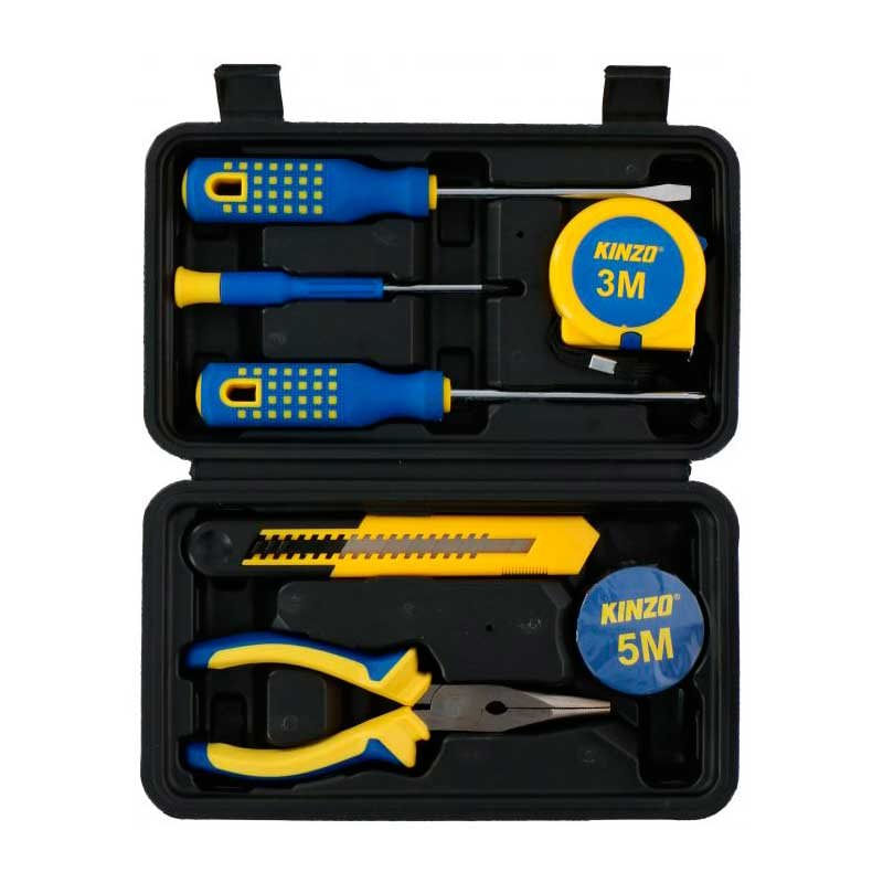 Un auténtico imprescindible que no debe faltar en ningún hogar. Este conjunto de herramientas básico de Kinzo contiene las herramientas esenciales para realizar pequeños trabajos. Las 8 piezas están cuidadosamente empaquetadas en una caja de PVC sólido que facilita mucho su transporte. El juego consta de: 1 destornillador Phillips, 1 destornillador con pomo plano y 1 destornillador de precisión PH1x50mm. En la caja de herramientas también encontrarás 1 cúter, unos alicates con mandíbula larga, 1 rollo de cinta y 1 metro enrollable.