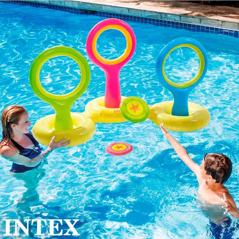 Este juego hinchable de discos voladores de la marca Intex es perfecto para disfrutarlo durante todo el año, ya que con él podrás jugar dentro del agua o instalarlo en el jardín. Tiene un diseño de colores vivos llamativo, está fabricado de vinilo transparente de alta calidad e incluye 3 discos hinchables de color verde, fucsia y azul, a juego con el centro de juego. El hinchable tiene una base amarilla que sirve para sujetar los tres postes con agujero central por donde los niños tratarán de pasar los discos y así ganar la partida. Está recomendado para niños a partir de 3 años bajo la supervisión de un adulto e incluye parche de reparación para reparar pequeños arañazos o poros.