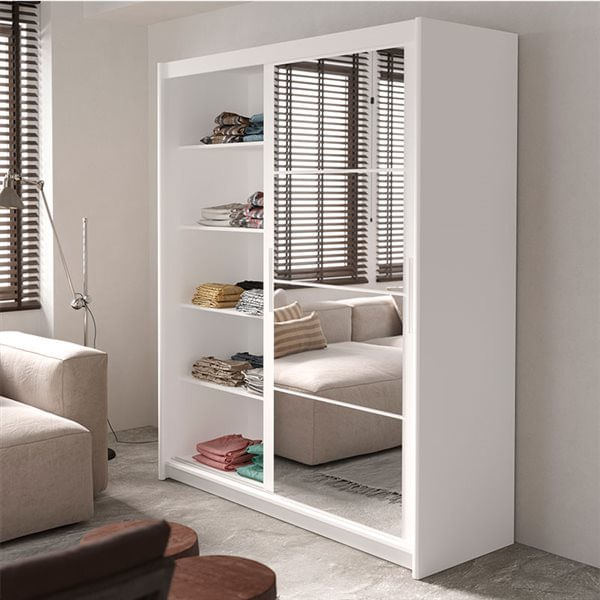 El armario modelo Saturno viene con 2 puertas correderas y mucho espacio de almacenaje repartido en 1 barra para colgar y 5 estantes interiores. Está fabricado en aglomerado de buena calidad y cuenta con espejo integrado en una de las puertas para que puedas darte esos últimos retoques antes de escoger tu conjunto de ropa. Quedará genial en cualquier estancia de tu hogar gracias a su estilo elegante de líneas rectas y a su combinable color aportando mucha frescura y un gran espacio de almacenaje. Es muy fácil de limpiar, bastará con pasarle un paño húmedo por la superficie para que quede perfecto. ¡Hazte con el tuyo ya!