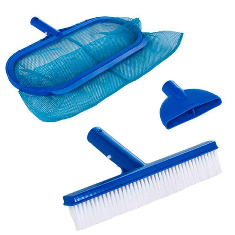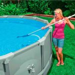 El kit de mantenimiento para piscinas Deluxe de la marca Intex es ideal para cuidar de tu piscina y tenerla siempre perfecta. Está especialmente pensado para piscinas de hasta 549 cm de diámetro. Requiere una depuradora con un caudal mínimo de 3785L/h para un correcto funcionamiento (no incluida). Incluye un cepillo para paredes, una red recoge hojas, un limpia fondos de absorción con 2 boquillas y una manguera con un conector en el extremo. Además, cuenta con mango telescópico de aluminio de 279 cm.