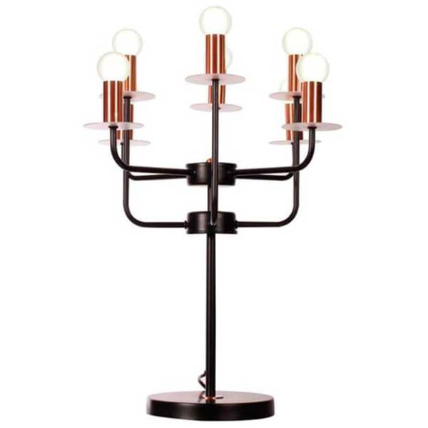 La lámpara de sobremesa modelo Candelabra de diseño exclusivo fusiona tradición y modernidad para darte un elemento decorativo único y estiloso. Tiene forma de candelabro y cuenta con 8 brazos y 8 bombillas. Sus líneas son geométricas, puras, simples y sofistica. El cuerpo es de metal tintado en color negro y los brazos son de un bonito cobre satinado. Funciona con 8 bombillas de casquillos E14 de un máximo de 25W (bombillas no incluidas). Combinará a la perfección en comedores, salones o recibidores ¡No te quedes sin la tuya y dale un toque de originalidad a tu hogar!