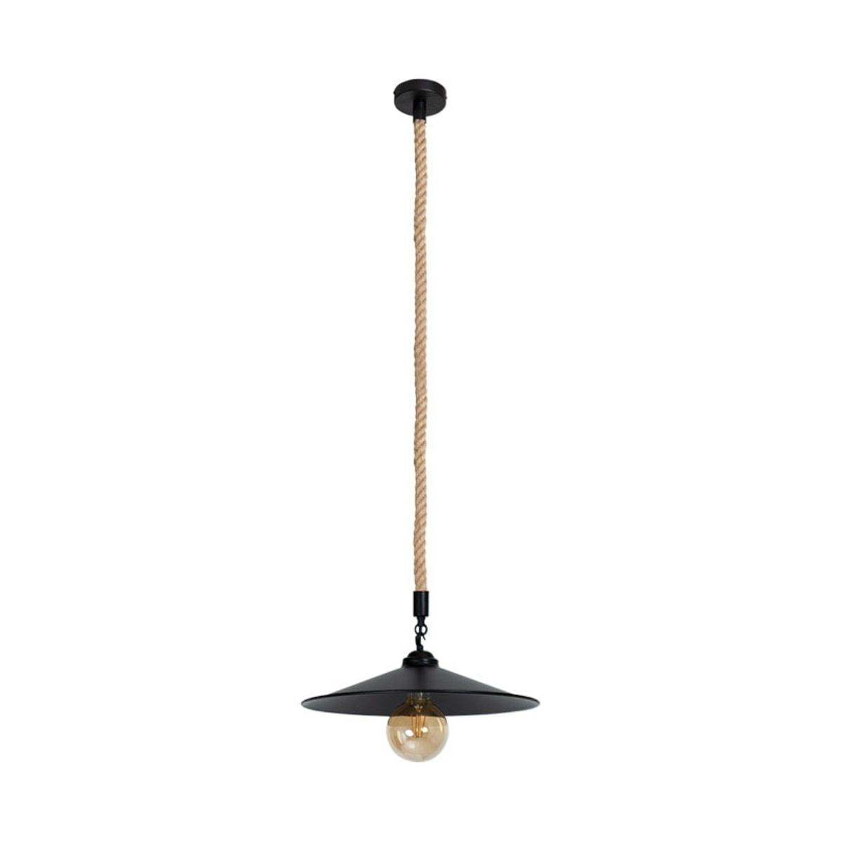 La lámpara está fabricada en cuerda, aportando un toque distintivo y artesanal a su diseño. Requiere una bombilla E27 con una potencia máxima de 60W (no incluida), permitiendo una iluminación cálida y acogedora. El portalámparas integrado facilita su instalación y uso.