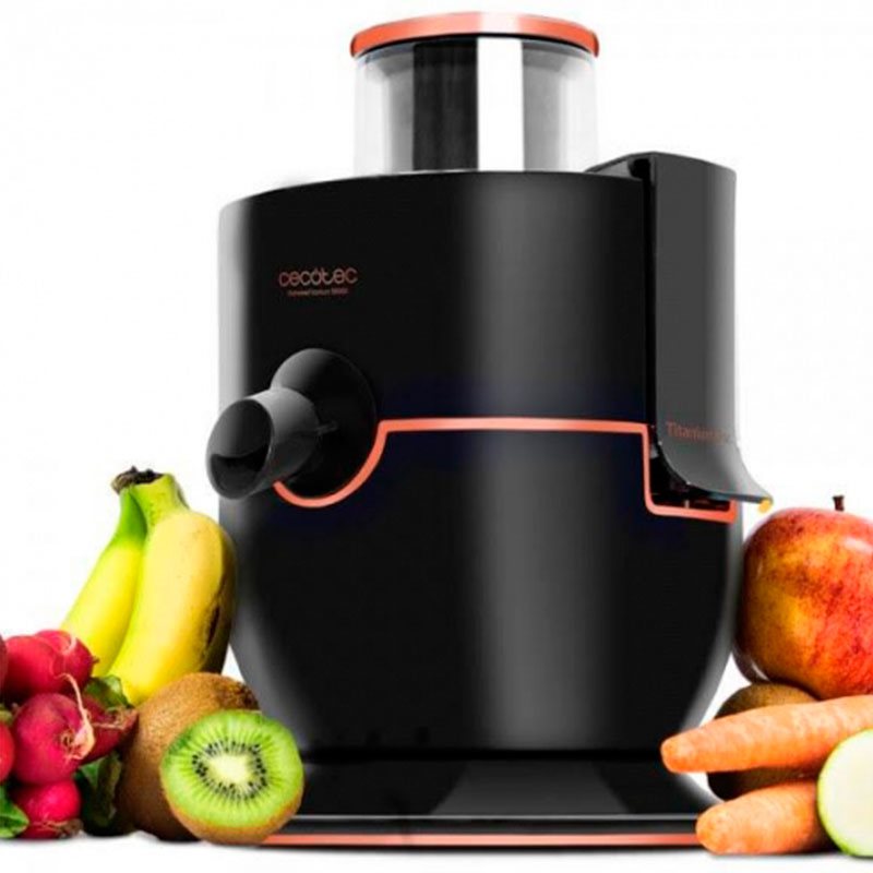 Licuadora Cecotec para frutas y verduras, cuenta con 19000 rpm, 1000W, canal entrada XL de 65 mm, disco con recubrimiento de titanio, 2 velocidades y libre de BPA. Perfecta para extraer el jugo a frutas y verduras con una potencia máxima de 1000W que consigue resultados perfectos. Disco con recubrimiento de titanio que mejora la dureza y mantiene un afilado por más tiempo. Canal de entrada XL de 75 mm para introducir frutas y verduras enteras. Gracias a su diseño y los 19000 rpm de velocidad, aprovecha mejor la fruta y extrae hasta un 30 % más de vitaminas. 2 velocidades para adaptarse a todos los alimentos. Incluye jarra para el zumo de 500 ml de capacidad. BPA-free, libre de tóxicos. Fácil de limpiar. Piezas no eléctricas aptas para lavavajillas. - Licuadora Orbital Extreme Titanium - Marca: Cecotec - Prensa - Jarra de 500 ml de capacidad - Manual de instrucciones - Base antideslizante y hueco recogecables- Boquilla antigoteo - 19000 rpm - Potencia: 1000W - Canal de entrada: XL (65mm) - 2 velocidades - Certificado CE