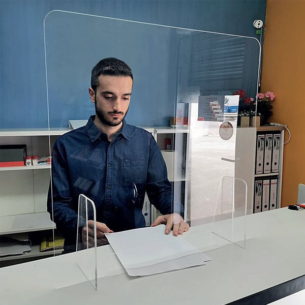 Fabricada en metacrilato transparente de 95 x 65cm con base estable de fácil montaje. Adecuada para estar de cara al público o en contacto con más personas, y para entregar productos de farmacias, estancos y establecimientos de alimentación. Apta para ser limpiada con alcohol.