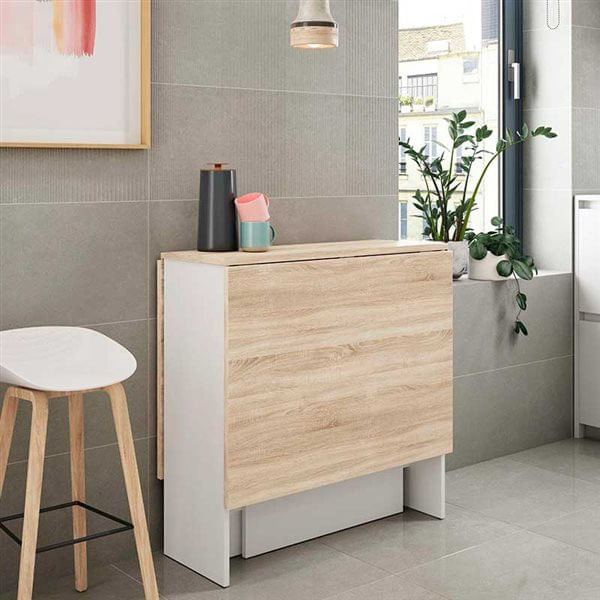 ¿Buscas una mesa compacta que te permita sentar a varios comensales cunado sea necesario? El modelo Fly es justo lo que estás buscando. Esta mesa con alas abatibles no ocupa prácticamente espacio cuando está cerrada, podrás dejarla pegada a la pared y utilizarla como estante auxiliar mientras no le das uso. Tiene 2 alas que podrás abrir a la vez si necesitas un gran espacio y también tiene la posibilidad de abrir solo una por si estás tú solo ¡es muy versátil! Está fabricada en tablero de partículas melaminizado, cuenta con bisagras tipo libro en las alas y viene con pivote de cierre y abertura de fijación. En la parte inferior del mueble viene con tacos ABS quitarruidos y antirrayaduras que protegen el suelo de cualquier rasguño.