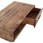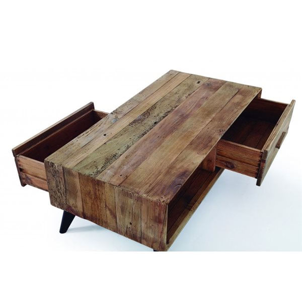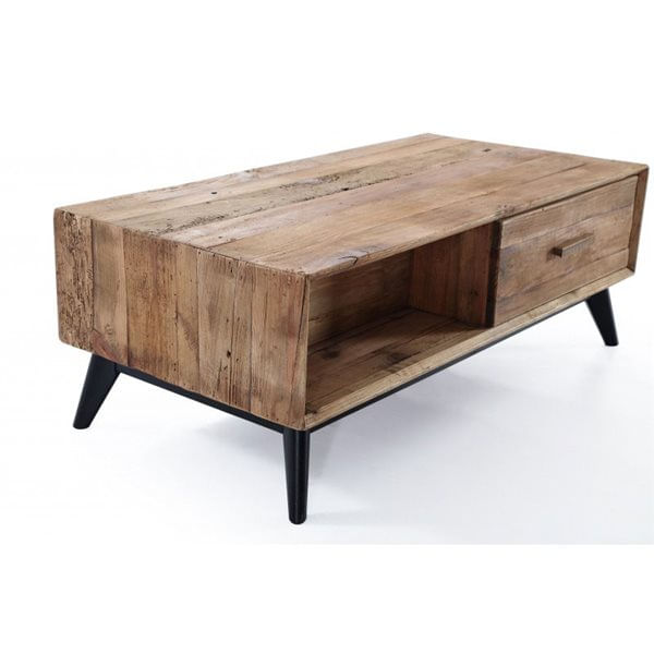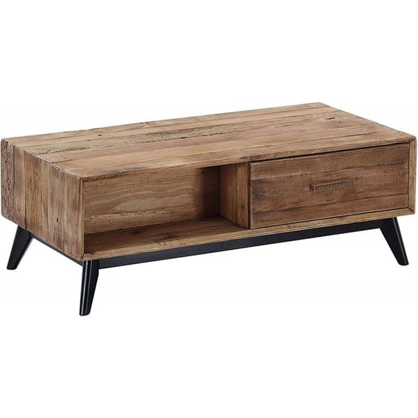 Mesa de centro Modelo Pixie Diseño: Vintage Fabricada con madera de pino reciclada Patas de madera color negro Patas con topes anti-rayado Cuenta con 2 cajones amplios Gran estabilidad y soporte Medidas: 43 cm de alto, 59 cm de ancho, y 120 cm de largo