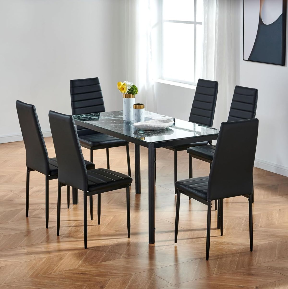 Esta mesa de comedor es todo un acierto si buscas algo moderno y original. Está hecha de metal y cristal, y su diseño imita el mármol negro, dándole un toque único y elegante. La estructura de acero en color negro es resistente y tiene cuatro patas rectas y sencillas, que le dan un aire minimalista. Lo que realmente la hace especial es el tablero de cristal, que tiene un acabado que imita el mármol y deja pasar un poco de luz, creando un efecto súper chulo que cambia según la hora del día.