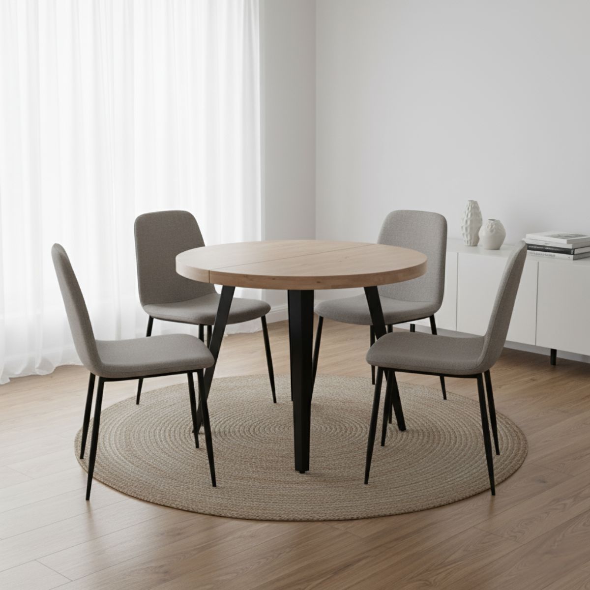 La mesa de comedor extensible modelo Berg combina estilo moderno y funcionalidad para cualquier espacio de comedor. Su diseño redondo y elegante permite aprovechar al máximo el espacio, convirtiéndola en el centro de atención de cualquier ambiente. La tapa extensible en madera de roble no solo añade un toque cálido y natural, sino que también brinda versatilidad. Esta mesa puede ajustarse fácilmente a 160 o 200 cm, adaptándose a diferentes necesidades, ya sea para reuniones íntimas o grandes cenas familiares.