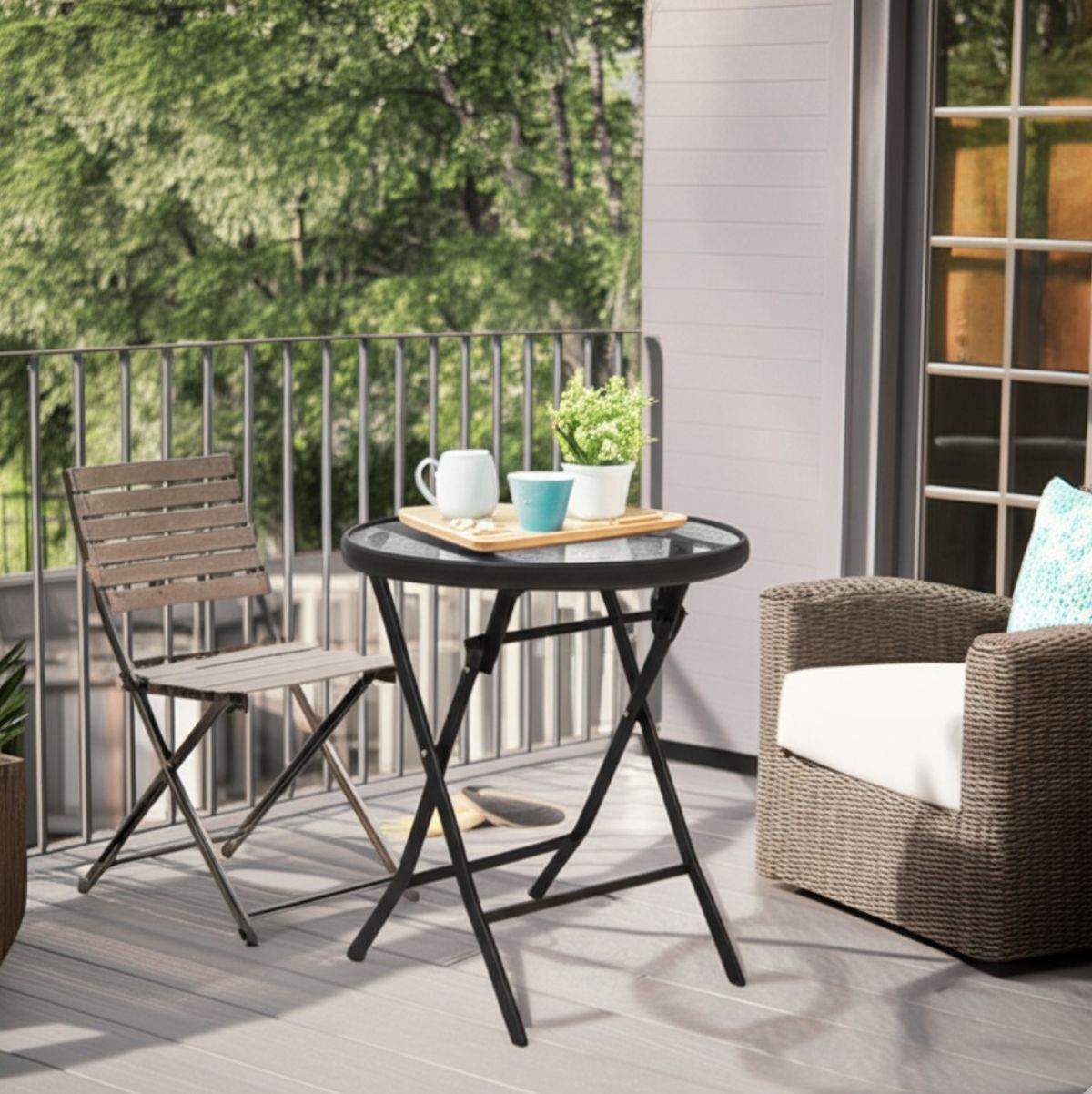 Disfruta de tus momentos al aire libre con esta elegante y práctica mesa de jardín plegable, diseñada para combinar funcionalidad, resistencia y estilo. Fabricada con una resistente combinación de vidrio templado y metal, esta mesa proporciona una superficie duradera, fácil de limpiar y altamente resistente a la intemperie. Su acabado evita el desprendimiento de pintura, manteniéndose como nueva por más tiempo. Se adapta perfectamente a distintos espacios, ya sea un jardín amplio o un pequeño balcón. Su diseño plegable la convierte en una opción ideal para quienes valoran la practicidad: se pliega fácilmente para almacenar o transportar, ahorrando espacio sin sacrificar estilo.