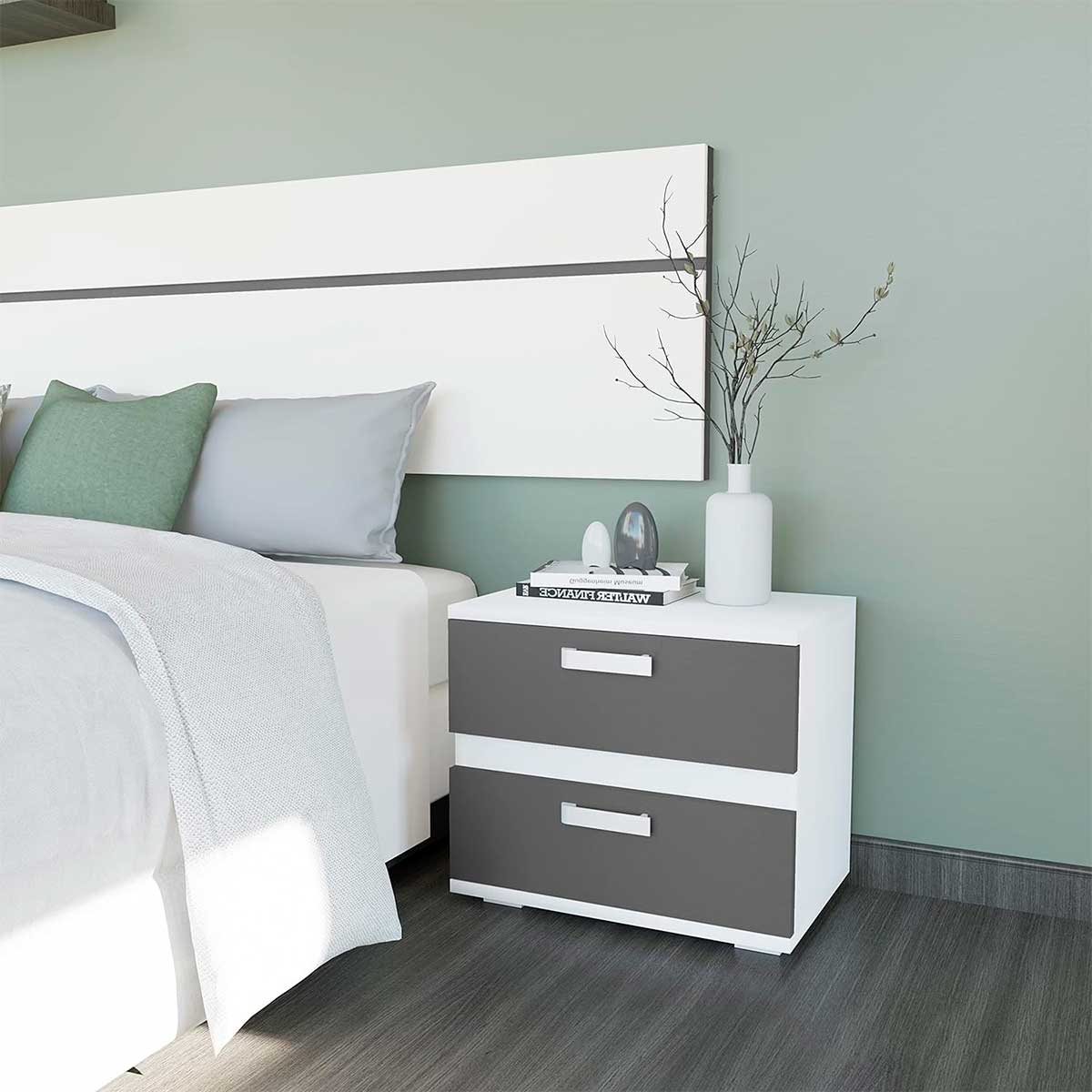 Completa tu descanso con la preciosa mesita de noche Cabra, ideal para un dormitorio individual o de matrimonio si se adquiere la segunda. Está compuesta por dos amplios cajones con tiradores de alta resistencia en color plateado. La mesita es ideal para apoyar sobre ella una lamparita de noche, tus libros o despertador. Además, sus patas la asilan del suelo y evitan la acumulación de polvo bajo ella. ¡No te quedes sin la tuya, ahora a un precio de locura!