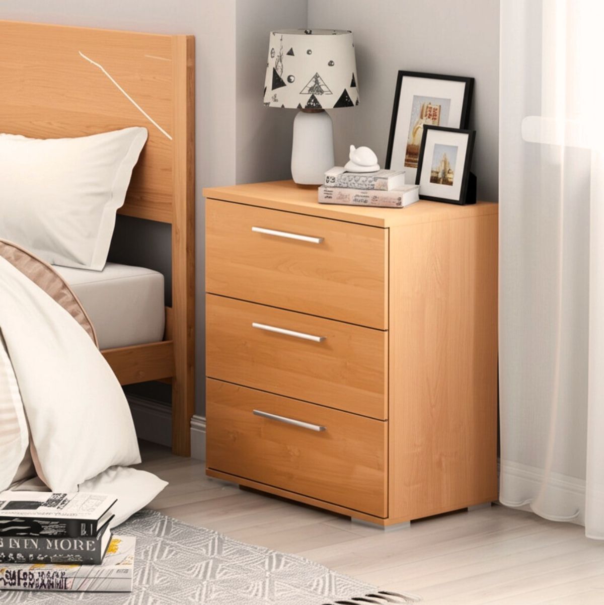 Completa tu dormitorio con la práctica y encantadora mesita de noche Caene, diseñada para ofrecer funcionalidad y estilo en un solo mueble. Cuenta con tres amplios cajones que te permitirán organizar tus objetos personales y tener todo lo que necesitas al alcance de la mano. Cada cajón incluye tiradores metálicos, lo que facilita una apertura cómoda y rápida. Además, está equipada con patas cromadas antideslizantes y antirayaduras, pensadas para proteger tus suelos y evitar la acumulación de polvo bajo la mesita, manteniendo el espacio siempre limpio.