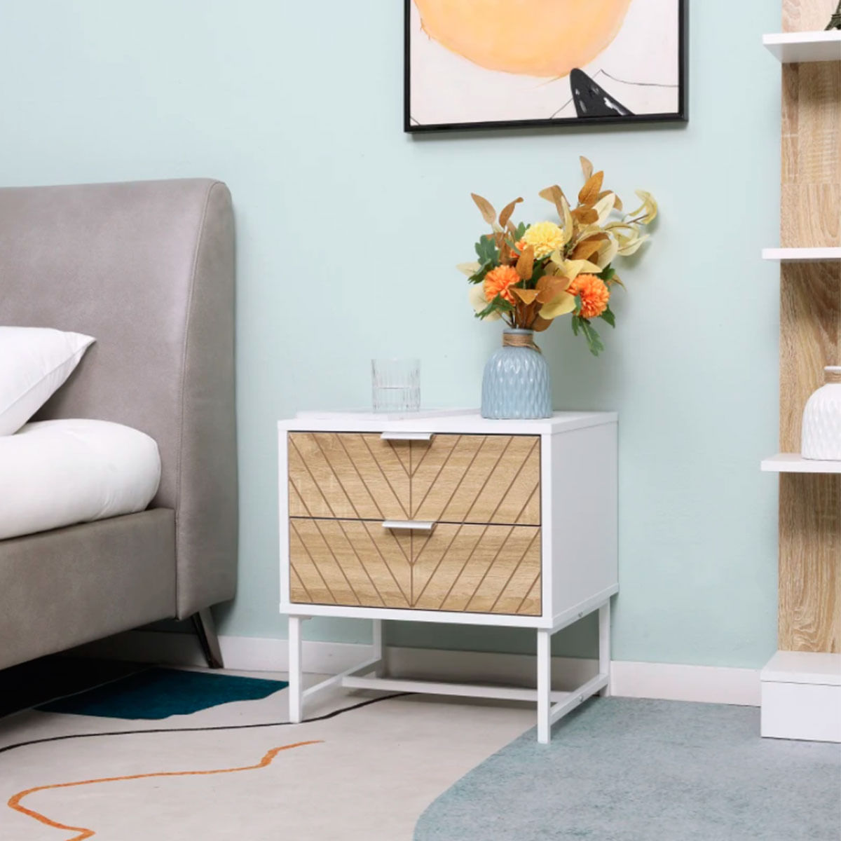 Esta estupenda mesita de noche de Homcom es todo lo que necesitas en tu dormitorio. Está fabricada con melamina de madera y estructura de acero, materiales muy resistentes, de alta durabilidad y de bajo mantenimiento. Es capaz de soportar un total de 20kg, y cada cajón 3kg. Gracias a su diseño elegante con el frontal de los cajones tallados con grabados lineales y su tonalidad neutra le proporcionarán a tu dormitorio un estilo sofisticado, y combinará con el resto de tu decoración sin problemas. Cuenta con 2 cajones de deslizamiento fácil y con gran capacidad de almacenaje para tu ropa interior, libros, etc. Su encimera es bastante amplia para poder poner una lámpara, el despertador, el móvil, etc. ¡No lo pienses más e incorpora diseño y elegancia en tu dormitorio a un precio bestial!