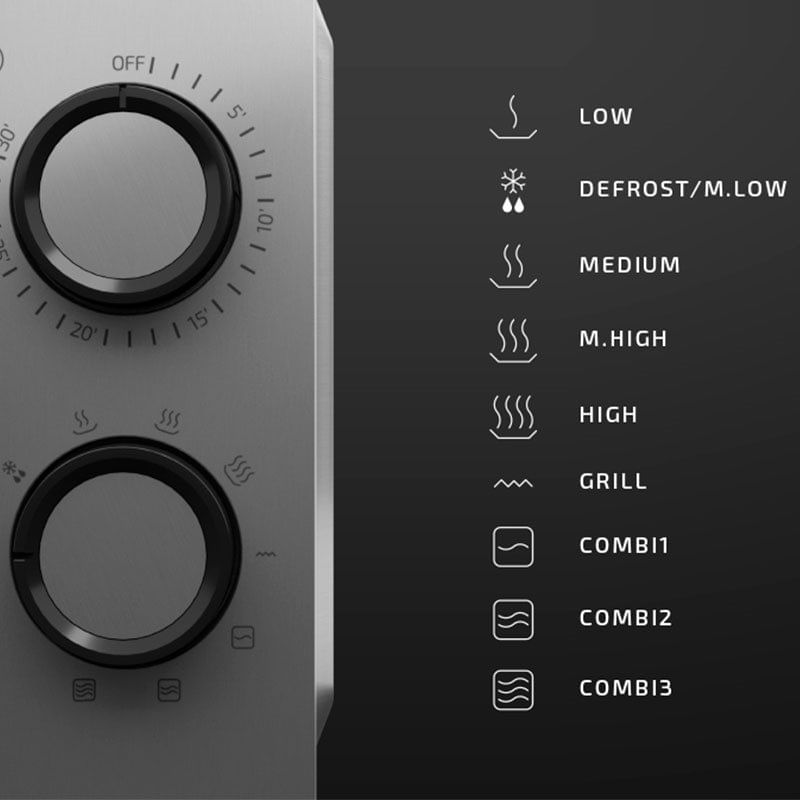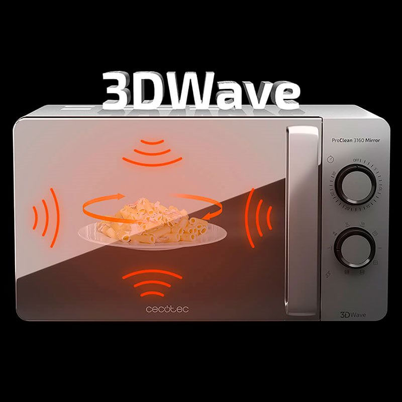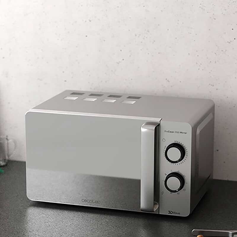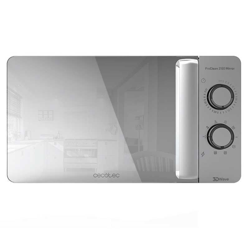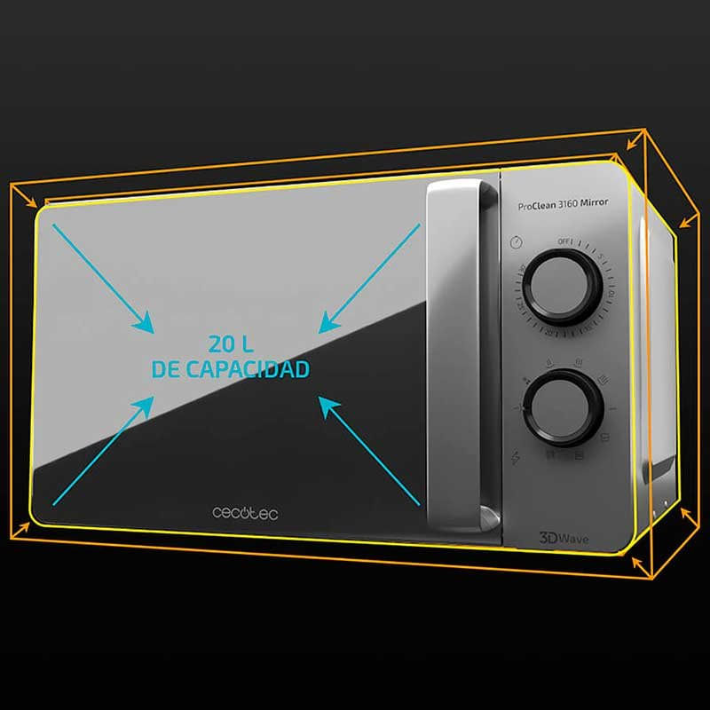 El elegante microondas modelo ProClean 3160 Mirror de la marca Cecotec cuenta una potencia máxima de 700W en 6 niveles seleccionables y grill de 800W de potencia. Viene con sistema de ondas altamente eficiente 3DWave que envuelve completamente tus alimentos. También incluye el modo descongelar y permite calentar cualquier elaboración, todo de la forma más intuitiva y sencilla. Su interior integra el revestimiento Ready2Clean que facilita una limpieza rápida y sencilla. En tan solo unos segundos estará impecable. Tiene una capacidad de 20L y cuenta con temporizador de hasta 30 minutos. Además, viene con avisador acústico de final de cocción y su plato tiene un diámetro de Ø24,3 cm.