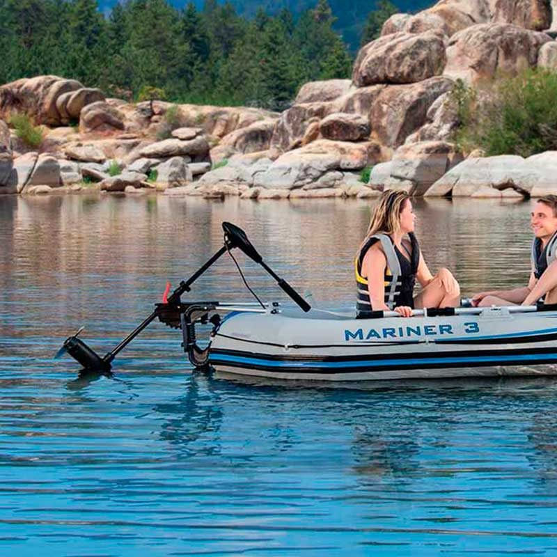 Disfruta relajadamente de un paseo en barco con el silencioso motor fueraborda de Intex. Cuenta con una potencia de 480W y es ideal para barcos, botes y lanchas hinchables. Un motor adecuado para navegar tanto en aguas saladas como dulces siempre y cuando después de usarlo en agua salada se enjuague y se almacene seco. Tiene 8 velocidades (5 hacia delante y 3 hacia atrás. Debe conectarse a una batería de ciclo profundo de al menos 60 A (no incluida).