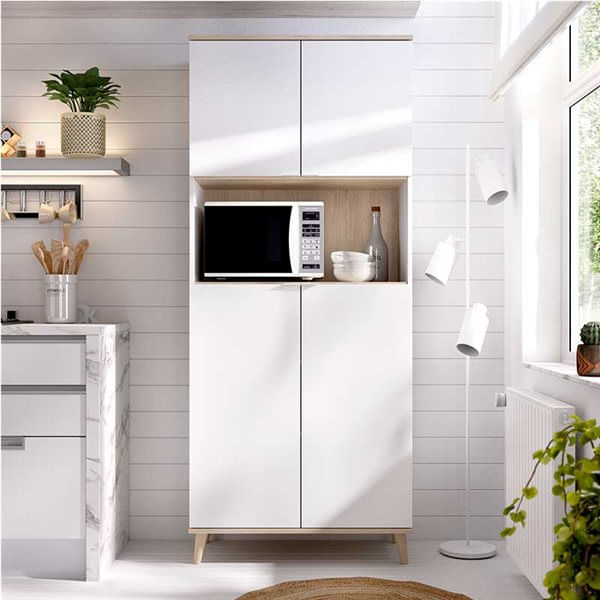 Descubre el aparador modelo Wok, una pieza práctica y espaciosa, ideal para ganar capacidad de almacenamiento en la cocina o el comedor. Está compuesto por dos armarios de gran tamaño y un compartimento abierto pensado para colocar el microondas, el horno o la freidora de aire. En su interior dispone de un amplio compartimento superior y tres espacios en la parte inferior. Se fabrica en tablero de partículas melaminizado, con tiradores tipo uñero de ABS y patas del mismo material en color roble. Su estructura, firme y estable, asegura un mueble resistente y duradero. Además, incluye los herrajes necesarios para fijarlo a la pared y aumentar la seguridad. El montaje resulta sencillo y, gracias a su diseño minimalista y a la combinación de colores, encaja perfectamente en cualquier estancia del hogar donde se necesite más espacio de almacenaje.