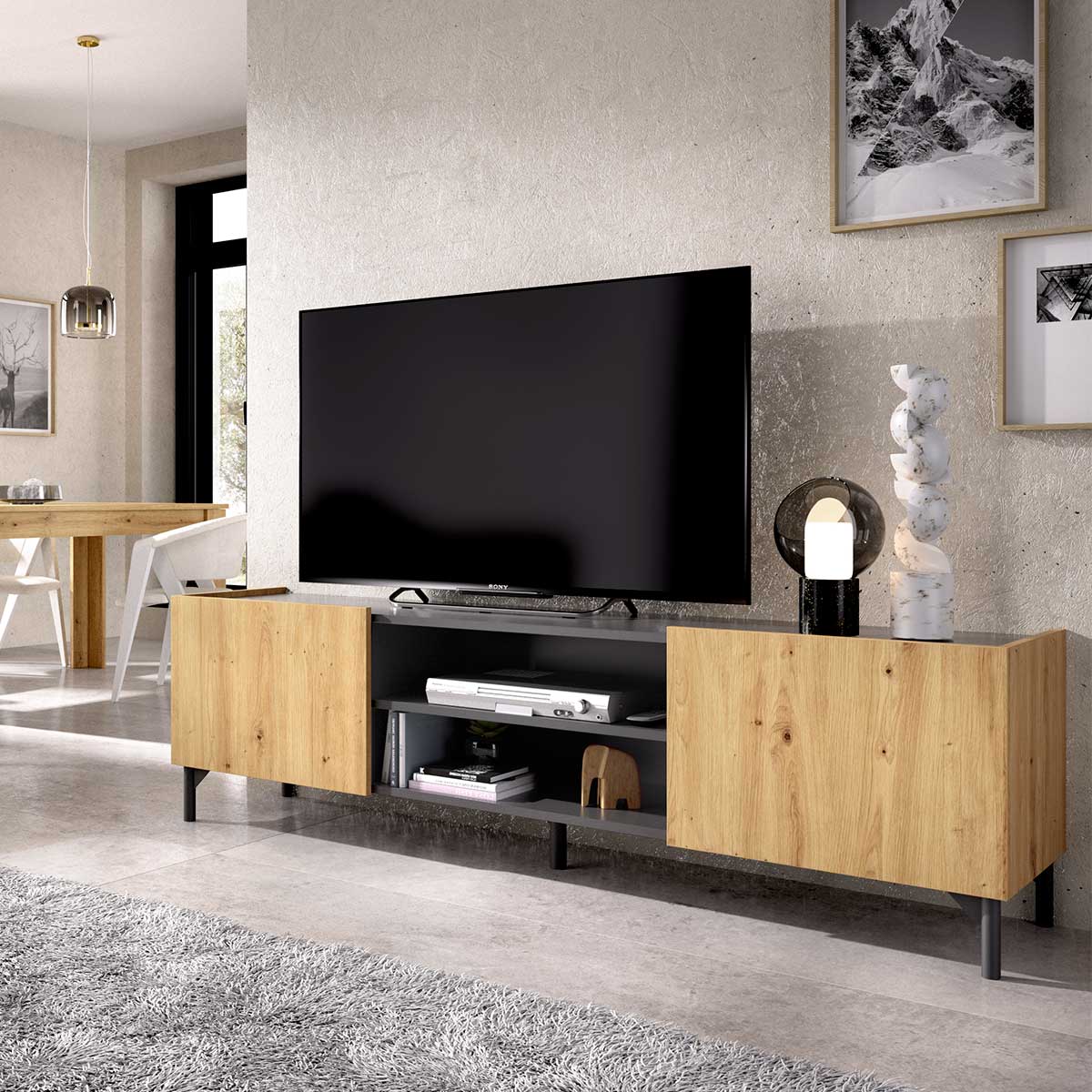 El mueble bajo de TV Astral presenta una línea nórdica con una superficie veteada y una combinación de colores que llevará a tu salón al siguiente nivel. Fabricado en melamina de buena calidad, está formado por 1 repisa superior donde colocar tu televisor (de hasta 65’’), videoconsolas, reproductores u objetos de decoración. En su frontal encontramos 2 huecos de almacenamiento y 2 puertas (1 a cada lado) que esconden 1 módulo de gran capacidad cada una. De fácil montaje y resistente al uso, este mueble combinará perfectamente con el resto de tu decoración. Gracias a la calidad de sus materiales y a los refuerzos de sus patas, podrás disfrutar de tu mueble Astral durante muchos años. ¡Cómpralo al mejor precio en Embargosalobestia!