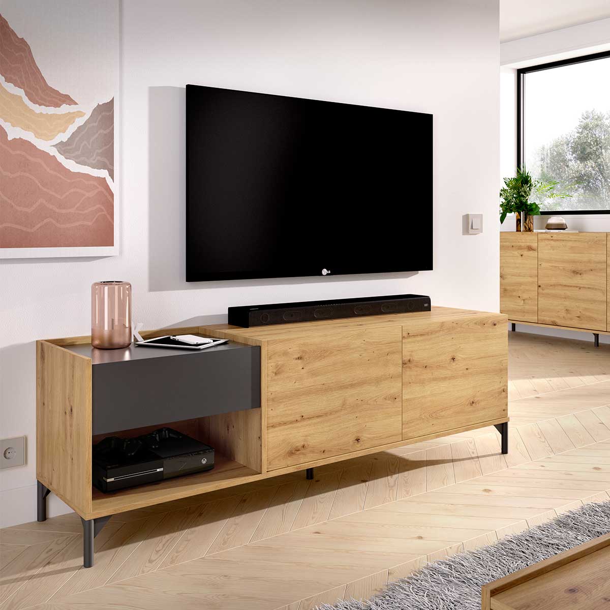 El mueble bajo de TV Lund presenta una línea nórdica que hará resaltar aún más tu salón. Fabricado con un tablero melaminizado de buena calidad, este mueble es ideal para todo tipo de salones, tanto pequeños como medianos o grandes. El mueble está formado por 1 repisa superior, donde podrás colocar tu televisor u otros dispositivos y reproductores, 2 puertas, 1 cajón y 1 hueco de almacenamiento. De esta forma, no solo nos aportará estética, sino que será un lugar donde colocar un gran número de elementos, aportándonos ese almacenamiento extra que tan bien nos viene. Su combinación de colores te enamorará desde el primer momento en el que lo veas. ¡Disfruta de este mueble bajo de TV al mejor precio en Embargosalobestia!