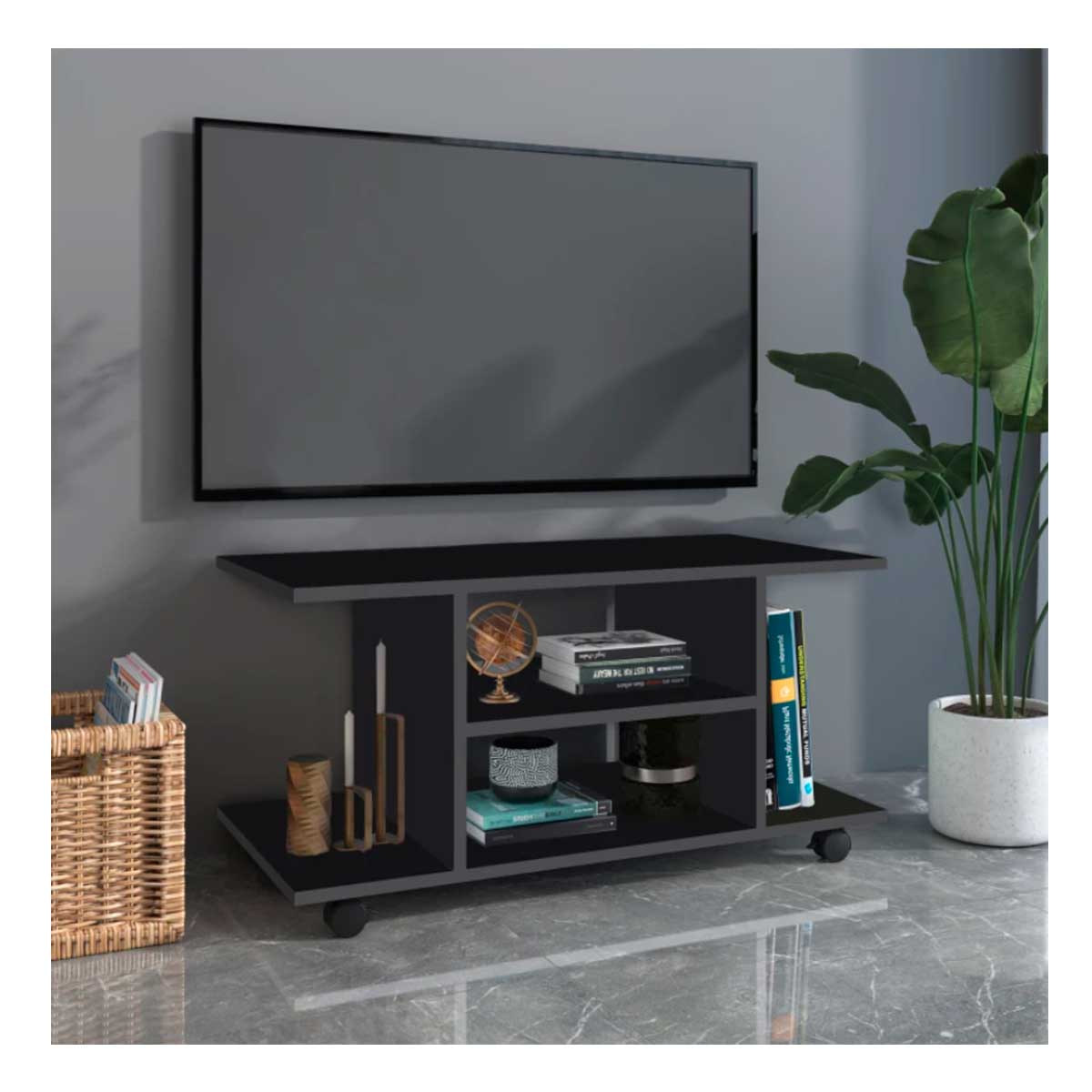 Este mueble bajo para TV de Homcom es muy práctico y multifuncional, porque no sólo puedes usarlo como mueble bajo, sino también como mesa de centro en tu salón, o como mesa auxiliar en clínicas u oficinas para tener revistas y decoración en salas de espera. Está fabricada con tablero de partículas con recubrimiento de melamina, muy resistente para un uso diario, capaz de soportar hasta 15kg de peso. Por ello, esta mesa es apta para televisores con un tamaño inferior a 42”. Cuenta con 4 ruedas giratorias 360º, 2 de ellas con frenos para mayor estabilidad de la mesa. Su diseño elegante, sofisticado y compacto hará que combine perfectamente con cualquier tipo de decoración. Además, es muy fácil de limpiar, ya que sólo necesitarás pasarle un paño húmedo. ¡No lo pienses más y hazte con ella ahora a un precio de chollo!