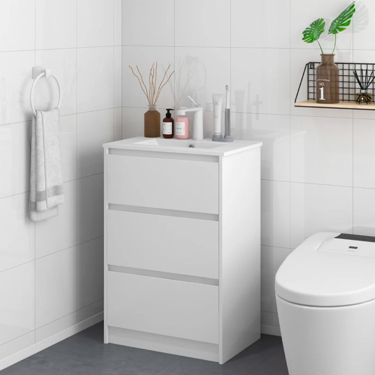 Si estás reformando tu baño o redecorando su interior, el mueble de baño con lavabo incluido Alika es perfecto para ti. Realza tu baño con este mueble formado por 2 amplios cajones en los que podrás organizar y almacenar toallas, cosméticos o tus productos de higiene. Con su acabado blanco brillante, es ideal para cualquier baño independientemente del tamaño, pues al incluir el lavamanos, ahorrarás espacio en tu hogar. Fabricado con cerámica sintética cuenta con una superficie robusta y sin juntas, lo que garantiza una gran durabilidad. También cuenta con un drenaje de desbordamiento para evitar derrames o inundaciones. La superficie lisa también es muy fácil de limpiar y evita acumulación de cal, el grifo que se muestra en las fotografías no va incluido. ¡Hazte con tu mueble con lavabo para el baño y aprovecha este magnífico precio!