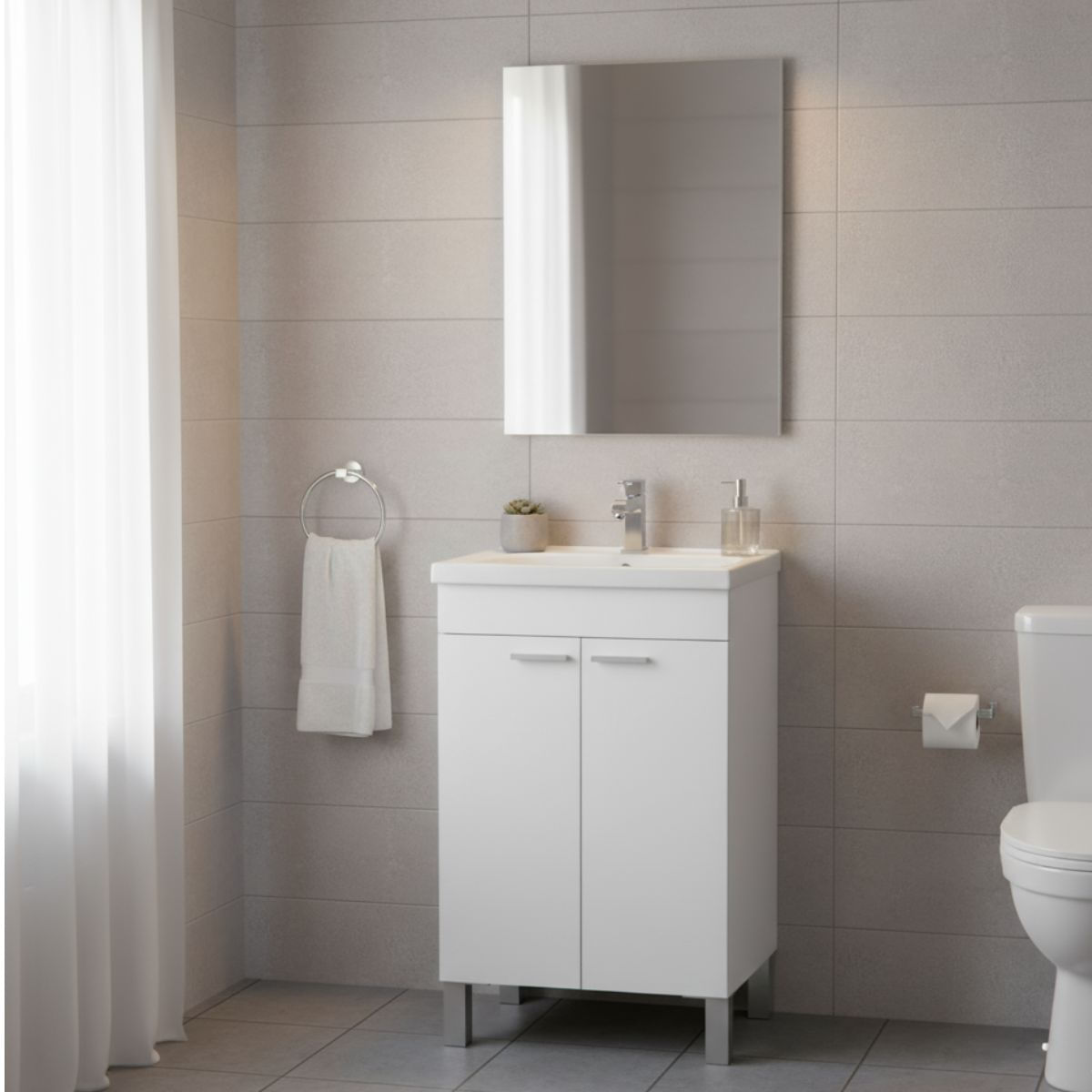 Estupendo mueble de baño modelo Koncept con dos puertas y tiradores rectangulares metalizados y gran capacidad de almacenaje que te encantará. Gracias a su diseño y tamaño, es perfecto para cualquier baño, especialmente recomendado para baños pequeños, ideal para tener espacio de almacenaje en espacios reducidos. El mueble también tiene un acabado brillo muy bonito, y está fabricado con melamina de alta calidad. Se sirve en kit de muy fácil montaje y con instrucciones claras. Se trata de un conjunto completo para tu baño que, además, incluye espejo y lavabo. ¡La mejor opción siempre al mejor precio!