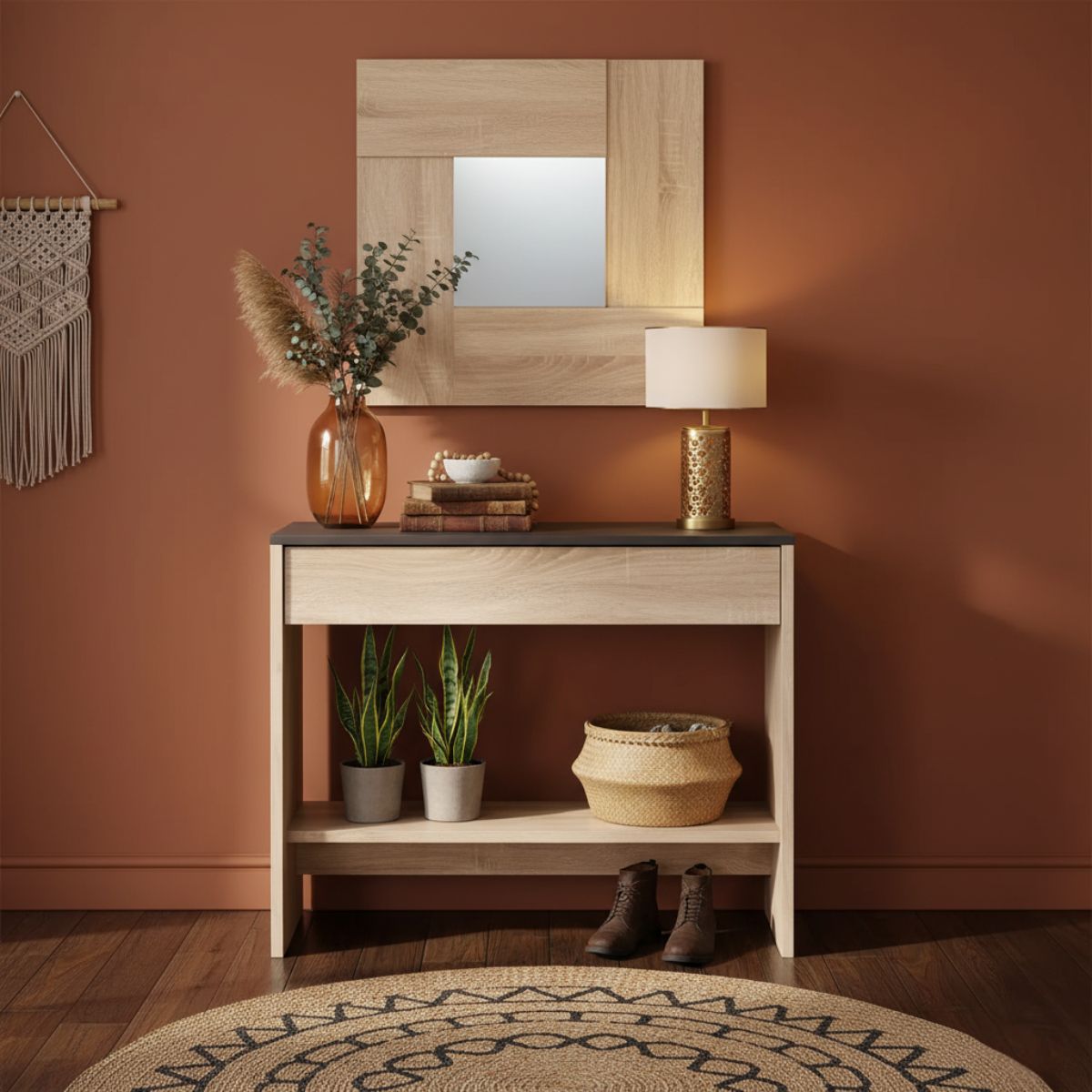 Este mueble recibidor modelo Oxys con espejo es estupendo para colocar en la entrada de tu hogar y poder tener organizadas las llaves y esas cosas que siempre queremos llevar encima cuando salimos de casa. Está fabricado en tablero de partículas melaminizado y el mueble cuenta con un cajón y un estante donde también podrás exhibir tu decoración favorita. En la parte inferior del mueble cuenta con tacos ABS quitarruidos y antirrayaduras para proteger la superficie sobre la que lo pongamos y los dispositivos de fijación del espejo a la pared están incluidos. Este mueble recibidor con espejo quedará fenomenal junto a cualquier decoración gracias a su diseño de finas y a su combinación de colores roble Canadian y oxido.