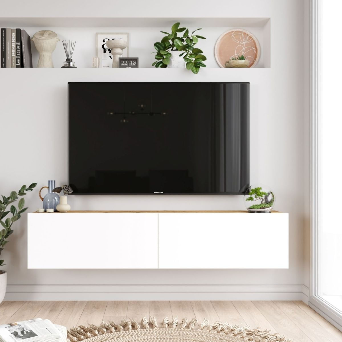 Dale un nuevo aire a tu salón o comedor con el mueble de TV Apia de 140 cm, diseñado para combinar estilo y funcionalidad. Su tamaño amplio permite colocar televisores grandes sin complicaciones, soportando pantallas de hasta 70’’. Gracias a sus dos puertas abatibles, tendrás fácil acceso a todo lo que necesites guardar, desde mandos y cables hasta otros objetos que quieras mantener a mano. Su instalación en la pared facilita la limpieza bajo el mueble, evitando obstáculos al pasar la escoba y manteniendo el espacio despejado. El interior del Apia está pensado para aprovechar al máximo el espacio, ofreciendo compartimentos que ayudan a mantener todo organizado y a mano.