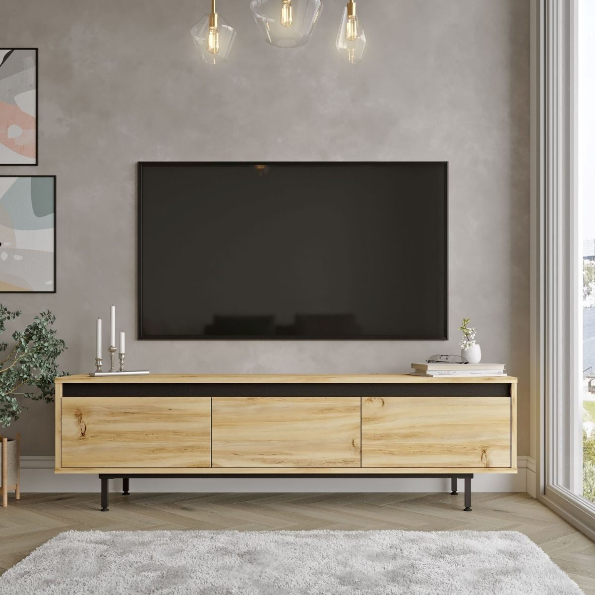 El mueble de TV modelo Ayote destaca por su moderno estilo y su elegancia, ideal para renovar cualquier salón con una estética actual y acogedora. Fabricado en madera con efecto natural, presenta vetas cálidas y realistas que aportan una sensación orgánica capaz de integrarse con facilidad en ambientes contemporáneos, nórdicos o con toques industriales suaves. Su diseño minimalista apuesta por líneas limpias y un acabado refinado que añade equilibrio visual al espacio. En la parte frontal, incorpora tres amplias puertas que permiten mantener el área de entretenimiento en perfecto orden. Detrás de ellas se encuentra un interior espacioso, pensado para organizar consolas, reproductores, mandos, cables o incluso libros y objetos decorativos que prefieras mantener resguardados.