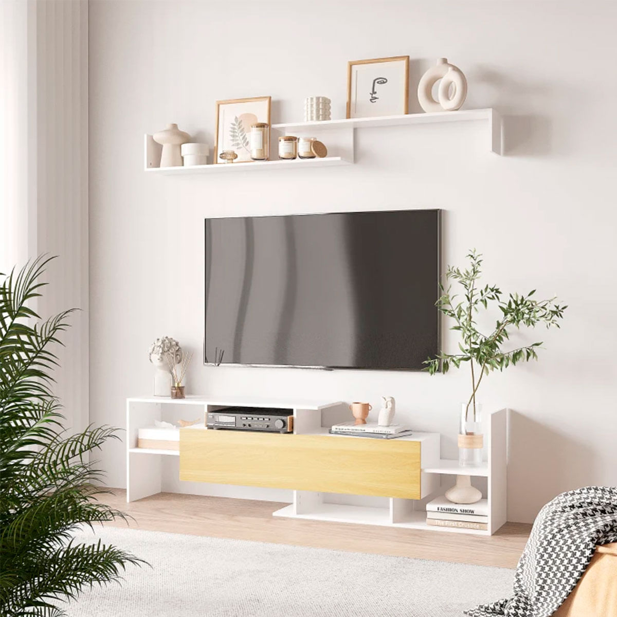 Completa tu salón con este precioso mueble de televisión Sturt, su moderno diseño formado por una bonita combinación de colores en tono blanco y madera y su forma geométrica y un tanto asimétrica dará el toque de dinamismo que tu salón necesita. Deleita a tus invitados con este mueble con gran almacenamiento, en él podrás tener todo organizado y también exhibir tus decoraciones. Además, cuenta con un armario con puerta batiente ideal para ocultar aquello que no quieres enseñar y mantener un ambiente de equilibrio. Además del mueble de televisión cuenta con dos estantes montados en la pared para ampliar el espacio de almacenamiento. Fabricado en melamina de la más alta calidad, la durabilidad y resistencia están garantizados con este fantástico mueble. No te lo pienses más y dale un toque moderno y sencillo a tu salón.