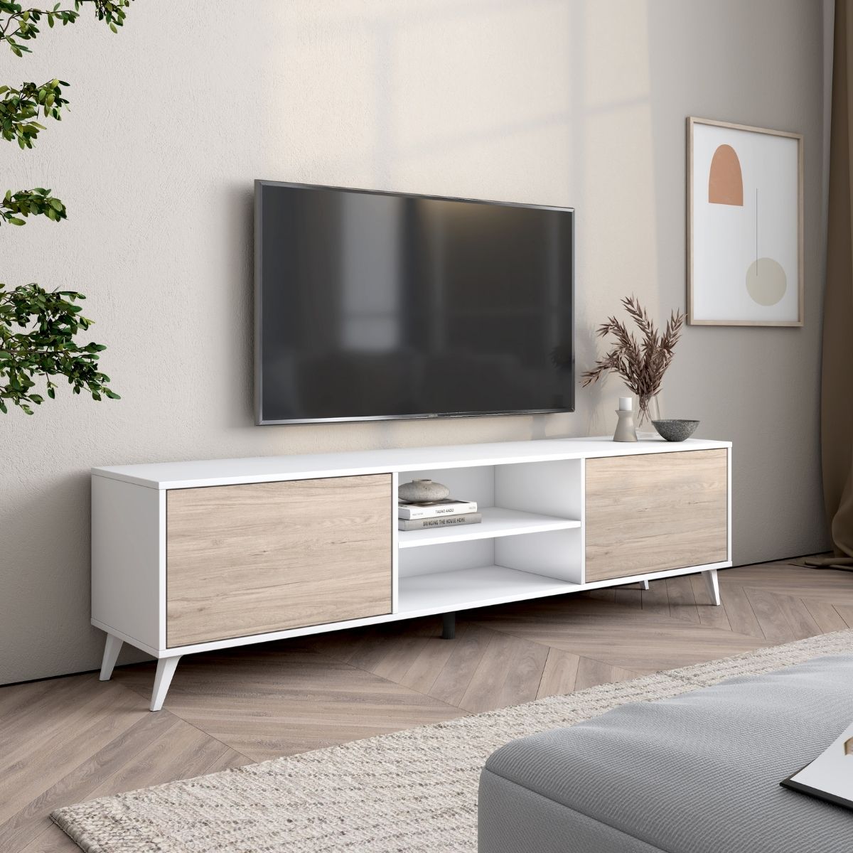 El mueble de TV Tito es una pieza versátil y elegante, pensada para completar tu salón con estilo y funcionalidad. Su diseño está preparado para televisores de gran formato y ofrece múltiples soluciones de almacenaje gracias a sus dos puertas laterales con sistema de apertura push, que aportan comodidad y una estética limpia al prescindir de tiradores. En la parte central incorpora dos compartimentos abiertos, perfectos para colocar dispositivos electrónicos, consolas o elementos decorativos, manteniendo todo al alcance y bien organizado. Las puertas laterales ocultan espacios de gran capacidad, ideales para guardar accesorios, cables o cualquier objeto que quieras mantener fuera de la vista.