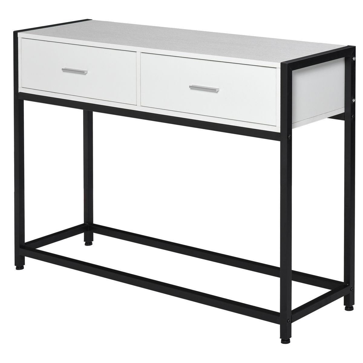 El mueble recibidor Afrodita es la pieza perfecta para quienes buscan un toque de elegancia moderna y minimalista en el recibidor o salón. Su diseño en blanco y negro, con cuerpo de melamina de madera en acabado blanco veteado y patas de metal negro, aporta un estilo refinado y adaptable a cualquier decoración. Esta consola de recibidor no solo es estéticamente atractiva, sino también funcional y práctica. Con 2 cajones espaciosos y una amplia encimera, esta consola proporciona espacio suficiente para organizar y exhibir tus objetos personales o decorativos como plantas, libros o marcos de fotos. Fabricada con una estructura de metal reforzado, la mesa ofrece una excelente resistencia y soporta hasta 50 kg en total, mientras que cada cajón soporta hasta 10 kg.