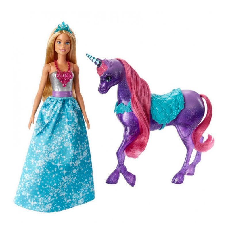 Desde el reino de la montaña de purpurina, llega Barbie con su precioso unicornio morado para conseguir que los sueños se hagan realidad. Barbie lleva un collar rosa muy detallado, un corpiño plateado y una larga falda con estampados de diamantes en color turquesa, a juego con su diadema. Su hermoso amigo unicornio es morado y translúcido, con un pelo rosa largo y brillante. Cuenta con un cuerno y una silla de montar turquesa, la cuál se puede quitar y poner cuando más le convenga. Sin duda es una muñeca con la que podrá dejar volar su imaginación y galopar por el reino de la montaña de purpurina viviendo mil aventuras juntos.