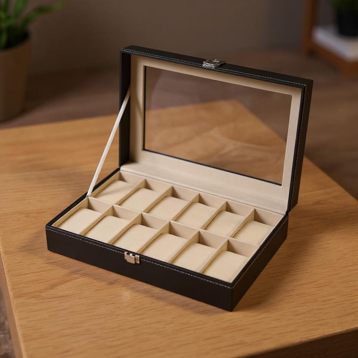 El organizador de relojes es el accesorio perfecto para mantener tu colección ordenada y protegida. Con capacidad para 12 relojes, este estuche cuenta con compartimentos individuales y un interior acolchado que evita arañazos y daños, garantizando el cuidado de tus piezas más preciadas. Cada compartimento está separado para asegurar que tus relojes permanezcan en su sitio. El exterior está acabado con detalles rematados que le aportan un toque elegante y sobrio, adecuado para cualquier estilo. Su diseño incluye una práctica ventana transparente que permite visualizar toda tu colección sin necesidad de abrir el organizador.