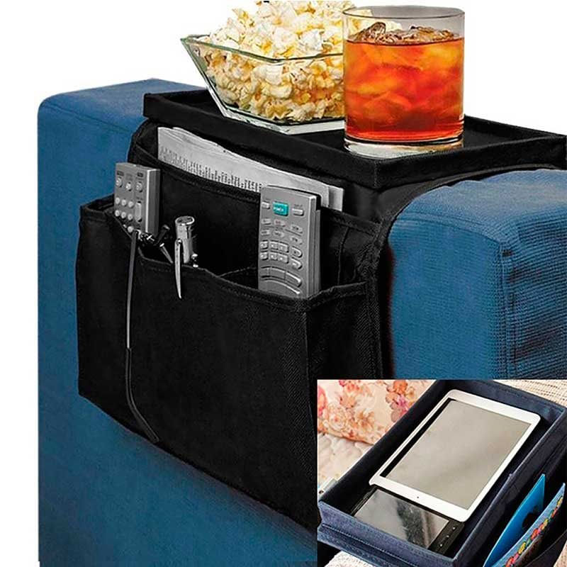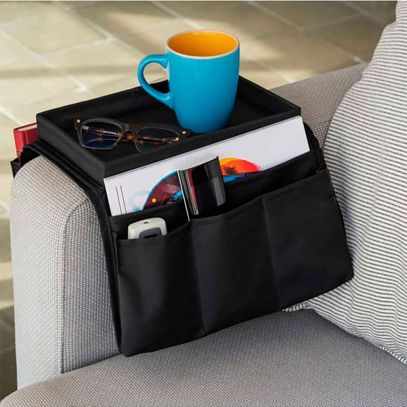 El organizador para sofá de la marca We Houseware es perfecto para organizar y tener siempre a mano todo lo necesario cuando estamos cómodamente tumbados en el sofá. Desde los mandos del televisor y el aire acondicionado, hasta tu Kindle, el libro que estés leyendo en el momento, tus gafas o, ¿Por qué no? Coloca tu bebida y un rico aperitivo para disfrutar de tu peli favorita en la bandeja que incluye en la parte superior. Está fabricado en poliéster de color gris oscuro y viene con 6 bolsillas de gran capacidad y una bandeja con bordes elevados.