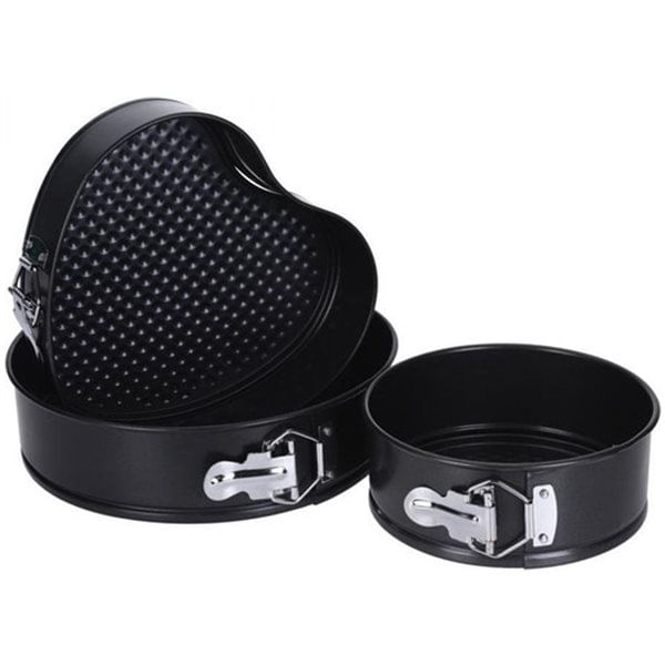 Con este set de moldes podrás hornear los pasteles más deliciosos y desmontarlos fácilmente. Contiene 3 piezas distintas, dos de ellas son de forma redondeada y la última tiene forma de corazón. Todos los moldes incluyen resortes para poder extraer las preparaciones con facilidad después del horneado. Los materiales de estos moldes son metal inoxidable con un recubrimiento antiadherente negro que evita que los alimentos se peguen y permiten una limpieza muy sencilla. Todo el set es apto para horno y desmontable para introducirlo en el lavavajillas.