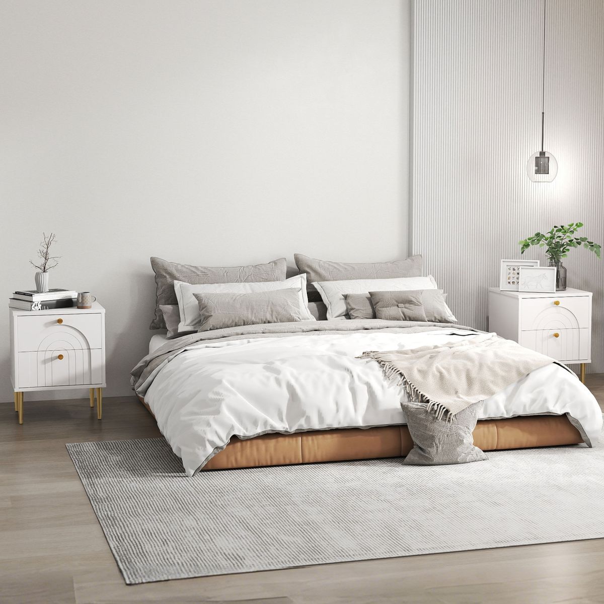 Dale un toque de elegancia y funcionalidad a tu dormitorio o salón con este conjunto de dos mesitas de noche modelo Akira de Homcom. Su diseño combina un acabado blanco con detalles dorados que aportan un estilo sofisticado y moderno a cualquier espacio, creando un ambiente acogedor y cuidado. Cada mesita cuenta con dos cajones espaciosos que permiten mantener tus objetos esenciales organizados y siempre al alcance, mientras que su superficie superior ofrece un lugar perfecto para lámparas, libros o cualquier accesorio que quieras tener a mano.