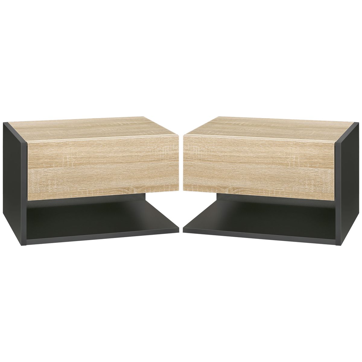 ¿Te falta espacio junto a la cama, pero no quieres renunciar al estilo? El pack de 2 mesitas de noche flotantes modelo Nube de Homcom es justo lo que necesitas. Con un diseño moderno en color negro y roble, estas mesitas colgantes se instalan directamente en la pared, permitiéndote regular la altura y dejar el suelo completamente libre. ¡Adiós a la suciedad acumulada y hola a una limpieza rápida! Cada mesita cuenta con un cajón y un estante abierto, el combo perfecto para guardar lo esencial: libro, móvil, gafas o lo que necesites tener a mano. Fabricadas en tablero aglomerado con acabado laminado, son resistentes y soportan hasta 8kg cada una. Además, su diseño compacto las hace ideales tanto para dormitorios principales como para habitaciones de invitados. Con este set, darás un toque de estilo y funcionalidad a tu rincón de descanso sin complicaciones.