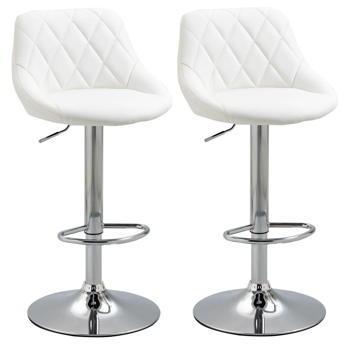 Estos taburetes modelo Shangai de Homcom son una excelente elección para complementar tu mesa alta, mueble bar o mostrador. Diseñados con un respaldo curvado, sin brazos y con la capacidad de girar, estos taburetes proporcionan una experiencia de sentado ergonómica que permite libertad de movimiento. El asiento está completamente acolchado, garantizando una comodidad superior, y cuenta con un diseño elegante en forma de diamantes realizado mediante costuras. La base metálica redonda y pesada proporciona una estabilidad y resistencia sobresalientes, haciendo que los taburetes sean seguros y duraderos. Además, la altura del asiento es ajustable entre 60 y 81 cm, lo que permite adaptarlos a diferentes tipos de mesas. El reposapiés integrado ofrece un soporte adicional para las piernas, incrementando la comodidad. Para proteger tu suelo, las bases están equipadas con almohadillas de caucho antideslizantes. Este pack de dos taburetes requiere montaje, pero las instrucciones son claras y fáciles de seguir, asegurando un proceso de montaje sencillo y rápido.