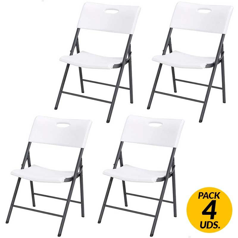 Pon fin a la falta de asientos en tus celebraciones y eventos con este pack de 4 sillas plegables en color blanco de la marca Lifetime. Se trata de un diseño de silla plegable cómoda y muy versátil que puedes tener almacenada sin ocupar espacio y que se adaptará a cualquier situación en la que requieras asientos adicionales. Son perfectas para usar tanto en interior como en exterior. Su estructura está fabricada en tubos de acero con revestimiento en polvo y tanto el asiento como el respaldo son de polietileno de alta densidad con protección UV. El asa que incluyen en el respaldo te facilitará llevarlas de un lugar a otro cómodamente.