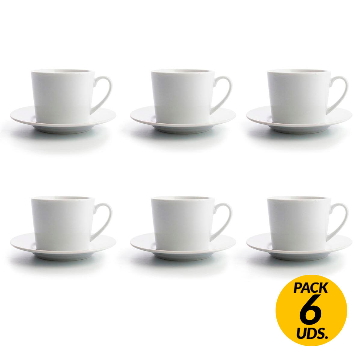 ¡Disfruta de momentos íntimos con el pack de 6 tazas con plato Renova Blanca de la marca Quid! Fabricadas con cerámica y porcelana de alta calidad, estas tazas desprenden un encanto único y una sensación placentera en cada sorbo. Con una capacidad de 22cl, cuentan con el tamaño ideal para deleitarte con tu café o infusión favorita. Sus asas de sujeción ergonómicas aportan una sujeción cómoda y segura. Por su parte, su forma redonda y estilizada añade un toque de elegancia a tu mesa. Estas tazas son tus compañeras ideales para el día a día. Perfectas para el desayuno, la merienda o esos momentos de pausa en tu jornada, siempre estarán ahí para darte la máxima comodidad. La practicidad también es un rasgo distintivo de las tazas Renova Blanca ya que son aptas para microondas, lo que te permite calentar tu bebida rápidamente sin necesidad de cambiar de recipiente. Y después de disfrutar tu bebida, podrás colocarlas directamente en el lavavajillas para una limpieza sin complicaciones. ¡Embárcate en un viaje de sabores y estilo con estas tazas de la marca Quid!