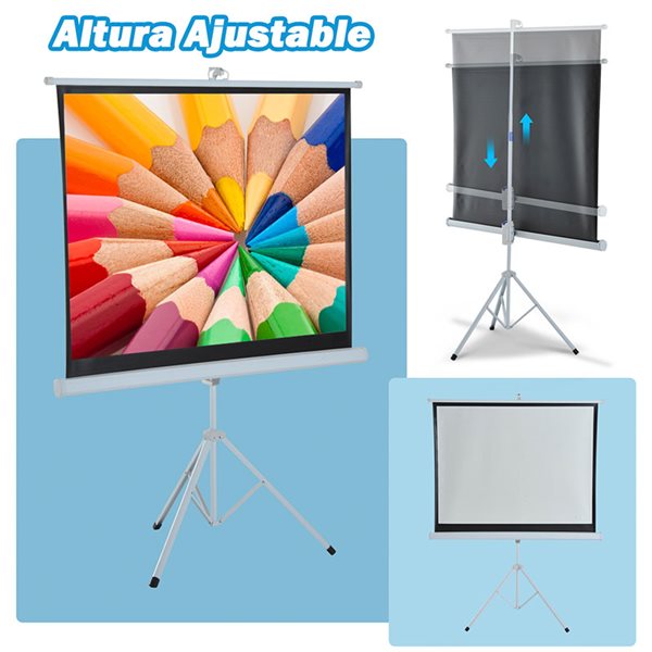 Esta pantalla de proyección, junto con el trípode de soporte, ofrece una manera económica de ver a gran escala lo que desee. Es la solución ideal para hacer presentaciones y proyectar vídeos en interiores o exteriores. Simplemente monte la pantalla con el soporte del trípode y tire de la pantalla hacia arriba hasta fijarla en el tope. Luego podrás disfrutar y divertirte al máximo. La pantalla es blanca con el borde de enmascaramiento negro, que permite un enfoque y una alineación de la imagen óptimos. ¡Perfecto para el hogar, la oficina, el aula o salas de audiovisuales!