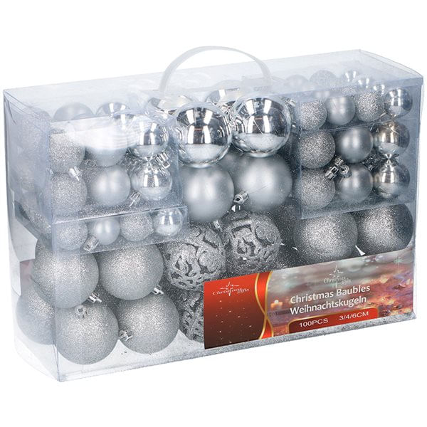 Decora tu árbol de Navidad o centro de mesa con este completo set de adornos navideños. Hasta un total de 100 bolas encontrarás dentro de este paquete de plástico transparente. Con acabados en mate, purpurina y brillante. Todas ellas están fabricadas en PVC de alta calidad. Incorporan agujero e hilo para que se puedan colgar o engarzar acorde a la creatividad que pretendas desarrollar. Las medidas de las bolas son de 3,4 y 6 centímetros.