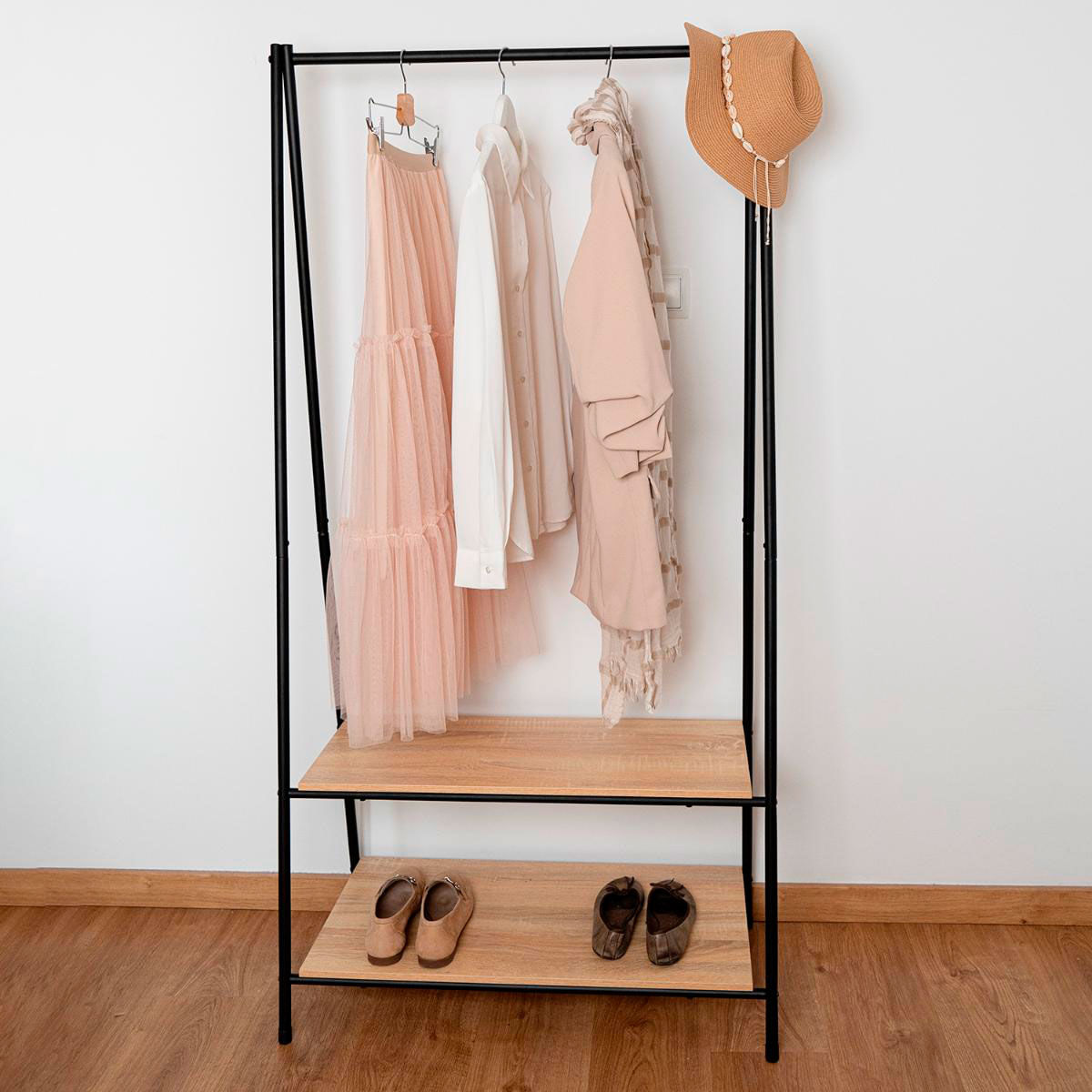 El perchero MOA de Vinthera es la definición de funcionalidad y estilo. Diseñado con materiales de primera calidad, este perchero se convertirá en la pieza central de tu espacio, ofreciendo una solución versátil y elegante para mantener tus prendas organizadas. Fabricado con acero resistente y un acabado antioxidación, el perchero MOA no solo es duradero, sino que también aporta un toque industrial moderno a cualquier entorno. Sus 2 estantes inferiores y la barra superior para colgar ofrecen suficiente espacio para prendas, zapatos y elementos decorativos, permitiéndote personalizar tu espacio de la manera que desees. La estabilidad es fundamental, y el perchero MOA cumple con creces. Con una base sólida y diseño robusto, puedes confiar en que tus pertenencias estarán seguras y bien organizadas en todo momento. Este perchero no solo es funcional, sino también un elemento decorativo en sí mismo. Su diseño industrial y la combinación de acero y madera MDF lo convierten en una pieza estilizada que se adapta a una variedad de estilos de decoración. ¡Ya lo sabes! ¡Disfruta de todas las ventajas que te ofrece el perchero MOA!
