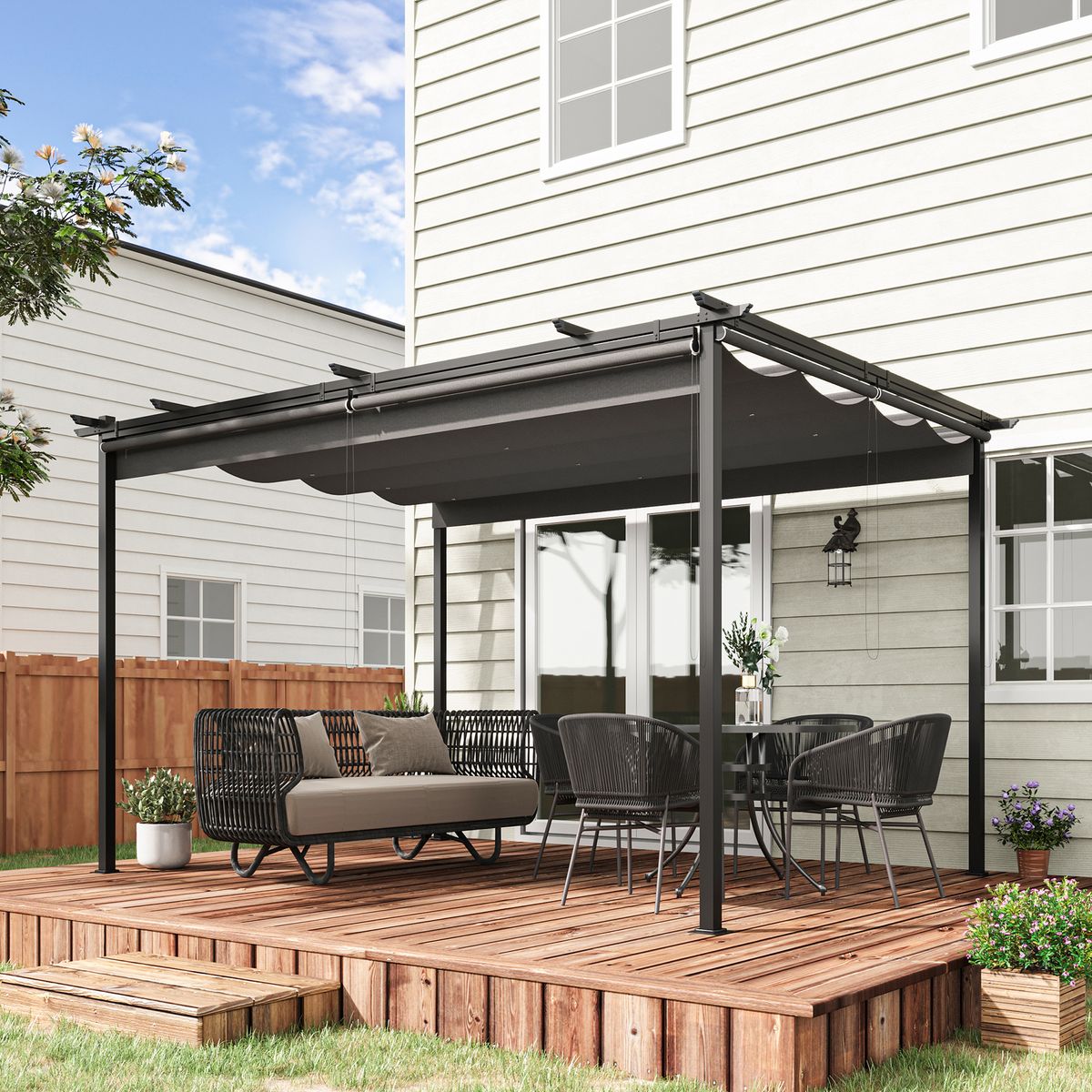 La pérgola Outsunny proporciona un elegante refugio al aire libre, con un diseño de 3x4 m que permite controlar el espacio con facilidad. Su toldo móvil y retráctil aporta versatilidad, mientras que las cortinas enrollables ofrecen sombra e intimidad ajustables. Con orificios de drenaje y opciones de instalación flexibles, es perfecta para relajarse con la familia o amigos. ¡Disfruta esta primavera y verano con esta fantástica pérgola de Outsunny!